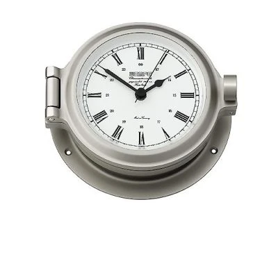 Massives Messinggehäuse Ø 120mm, matt vernickelt, Quarz Batteriewerk, Zifferblatt weiß mit röm. Zahlen.